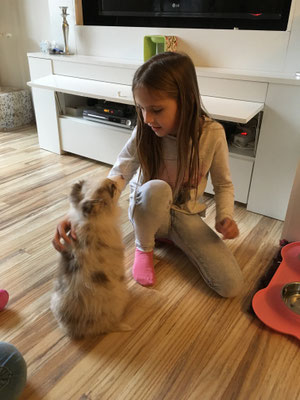 Ich bin Sia, ein Border-Collie Mädchen und heute bin ich 12 Wochen auf der Welt. Meine Familie holte mich in der 9. Woche. Bereits nach einer Woche habe ich verstanden was Sitz und Platz sowie Jump bedeutet. Wenn ich was richtig mache bekomme ich was Gutes oder mein Balli. Ich weiß auch schon wie ich meiner Familie sage, wann ich mein Geschäftchen verrichten muss. Dann darf ich gleich nach draußen.